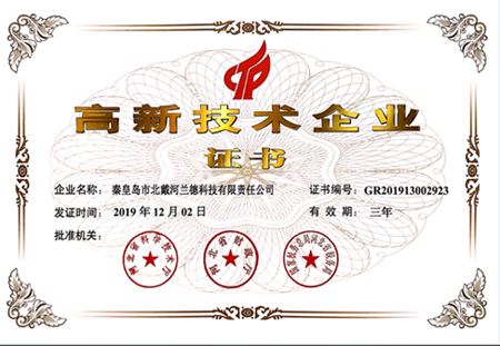 秦皇岛市北戴河兰德科技有限责任公司被评为省级高新技术企业,证书编号:GR201913002923