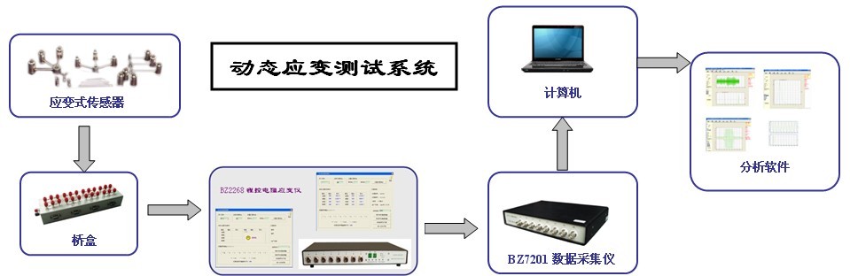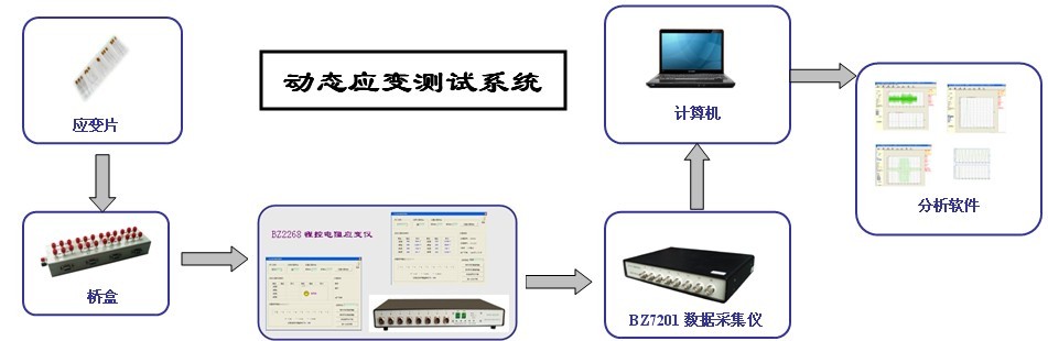 应变片--桥盒-- BZ2668动态应变仪--BZ7201数据采集仪--计算机--分析软件