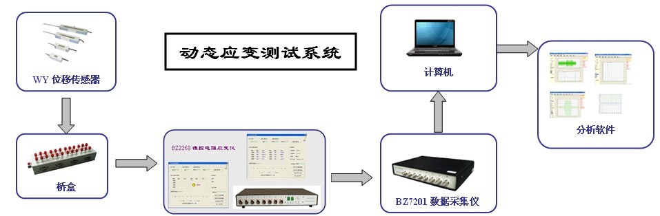 位移传感器--桥盒--BZ2668动态应变仪--BZ7201数据采集仪--计算机--分析软件