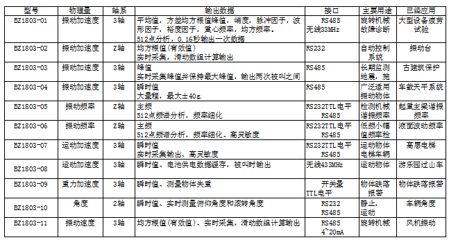 BZ1803系列三軸數(shù)字加速度傳感器是一款小而薄的低功耗3軸加速度傳感器,分辨率高(13位),測量范圍達± 16g。數(shù)字輸出數(shù)據(jù)為16位二進制補碼格式,可通過RS485接口訪問。它可以在傾斜檢測應用中測量靜態(tài)重力加速度,還可以測量運動或沖擊導致的動態(tài)加速度。其高分辨率(3.9mg/LSB),能夠測量不到1.0°的傾斜角度變化。 通過三個方向的加速度信號,可以測試出相對X、Y、Z三個方向的角度信號,可以作為多角度傳感器使用。 通過三個方向的加速度信號,可以通過一次積分運算得到X、Y、Z三個方向的振動速度,通過二次積分運算得到X、Y、Z三個方向的振動速度。 該傳感器提供多種特殊檢測功能。活動和非活動檢測功能通過比較任意軸上的加速度與用戶設置的閾值來檢測有無運動發(fā)生。敲擊檢測功能可以檢測任意方向的單振和雙振動作。自由落體檢測功能可以檢測器件是否正在掉落。這些功能可以獨立設置。集成式存儲器管理系統(tǒng)采用一個32級先進先出(FIFO)緩沖器,可用于存儲數(shù)據(jù),從而將主機處理器負荷降低,并降低整體系統(tǒng)功耗。低功耗模式支持基于運動的智能電源管理,從而以極低的功耗進行閾值感測和運動加速度測量。 應用領域: