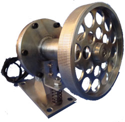 我們研制的皮帶速度監測保護系統探頭能克服以上缺點。它的基本工作原理是:利用外接觸輪將皮帶的線速度轉換成角速度(將皮帶的直線運動速度變成接觸輪的轉動速度),通過輪軸傳遞給電磁感應器件,將轉速的大小變成數字脈沖信號,通過電纜傳輸給監測保護系統控制器,由于數字脈沖信號是以數字方式傳輸,所以不易受到交流電和幅射電磁場的干擾,由于數字信號幅度大,對其形狀沒有嚴格限制,所以受電纜電阻和電容的影響極小,傳輸幾公里都不會誤碼,這樣就確保了測量速度的準確性和可靠性。